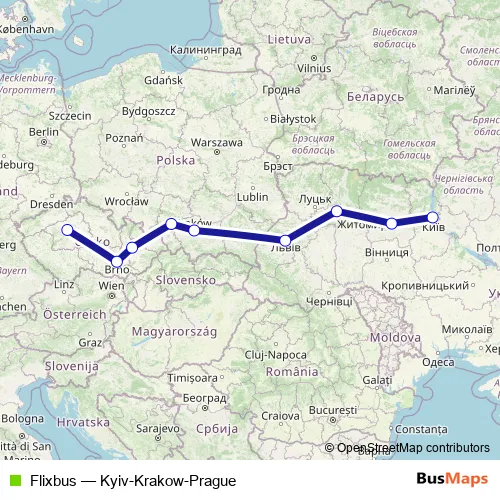 The first stop of the Flixbus bus route is Kraków, Kraków Czyżyny and the last stop is Prague, Prague ÚAN Florenc. Flixbus (Kyiv-Krakow-Prague) is operational during codziennie.