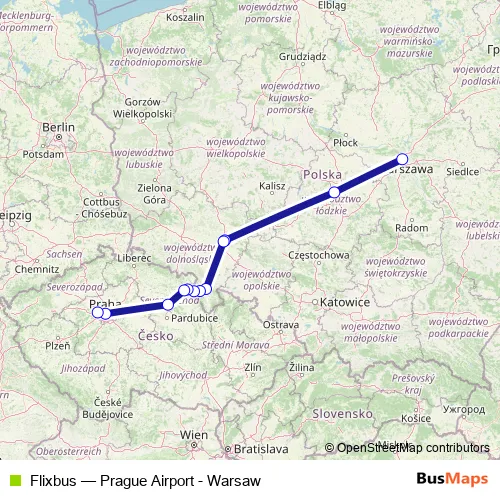 The first stop of the Flixbus bus route is Warszawa Bus Station and the last stop is Prague Airport Terminal 1/2. Flixbus (Prague Airport - Warsaw) is operational during codziennie.