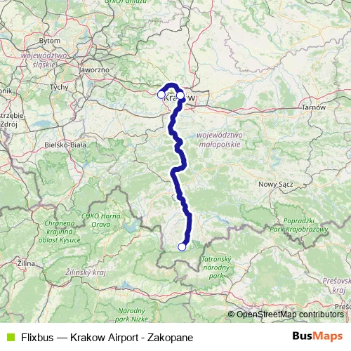 The first stop of the Flixbus bus route is Zakopane Bus Station and the last stop is Krakow Balice Airport. Flixbus (Krakow Airport - Zakopane) is operational during codziennie.