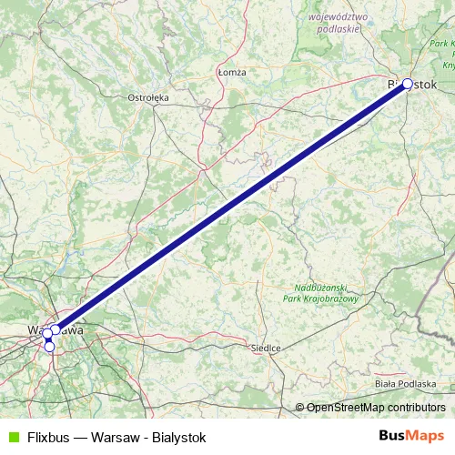 The first stop of the Flixbus bus route is Białystok, Białystok, Dworzec Autobusowy and the last stop is Warsaw, Warsaw Chopin. Flixbus (Warsaw - Bialystok) is operational during codziennie.