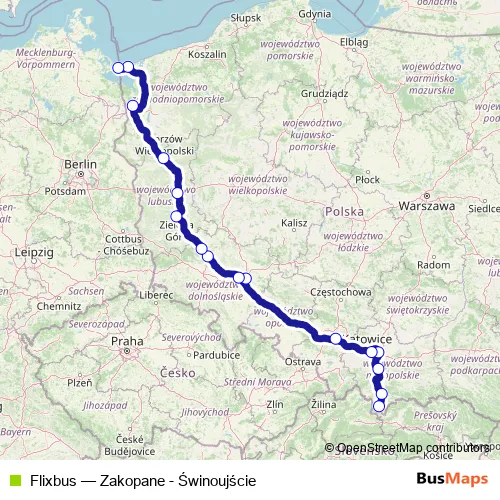 The first stop of the Flixbus bus route is Zakopane Bus Station and the last stop is Szczecin Bus Station. Flixbus (Zakopane - Świnoujście) is operational during codziennie.