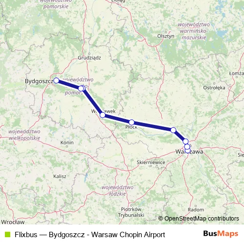 The first stop of the Flixbus bus route is Warszawa Zwirki i Wigury and the last stop is Bydgoszcz Bus station. Flixbus (Bydgoszcz - Warsaw Chopin Airport) is operational during codziennie.