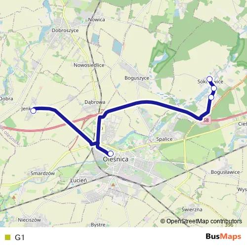 The first stop of the G1 bus route is Oleśnica - dworzec autobusowy and the last stop is Sokołowice - szkoła. G1 is operational during w dni robocze.