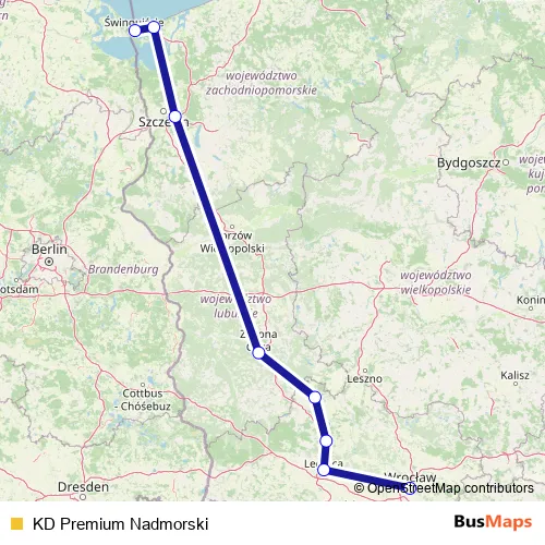 The first stop of the KD Premium Nadmorski rail route is Wrocław Główny and the last stop is Świnoujście. KD Premium Nadmorski (KD Premium Nadmorski) is operational during w weekendy.