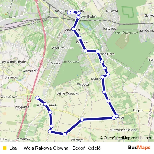 The first stop of the Lka bus route is Wola Rakowa Główna and the last stop is Bedoń Kościół. Lka (Wola Rakowa Główna - Bedoń Kościół) is operational during codziennie.