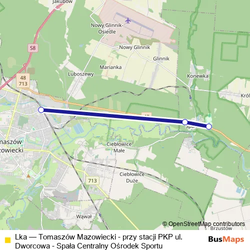 The first stop of the Lka rail route is Spała Centralny Ośrodek Sportu and the last stop is Tomaszów Mazowiecki - przy stacji PKP ul. Dworcowa. Lka (Tomaszów Mazowiecki - przy stacji PKP ul. Dworcowa - Spała Centralny Ośrodek Sportu) is operational during w weekendy.