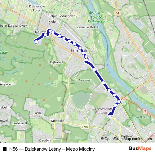 The first stop of the N56 bus route is Dziekanów Leśny and the last stop is Metro Młociny. N56 (Dziekanów Leśny – Metro Młociny) is operational during codziennie.