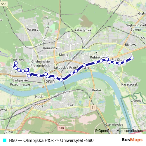 Miejski Zakład Komunikacji w Toruniu N90 Olimpijska P&R -> Uniwersytet -N90 Bus