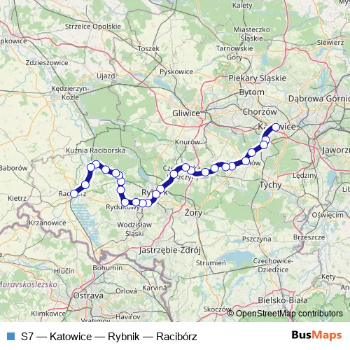 The first stop of the S7 rail route is Katowice and the last stop is Racibórz. S7 (Katowice — Rybnik — Racibórz) is operational during codziennie.