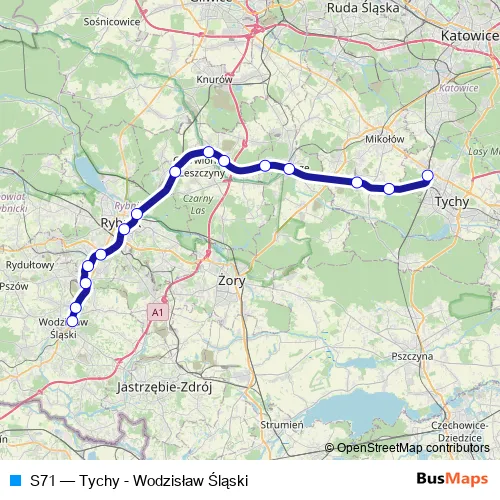 The first stop of the S71 rail route is Tychy and the last stop is Wodzisław Śląski. S71 (Tychy - Wodzisław Śląski) is operational during w dni robocze.
