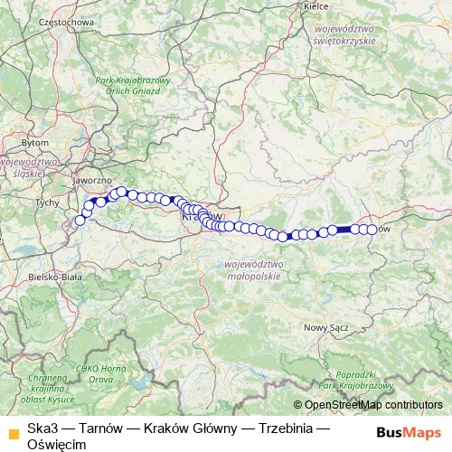 The first stop of the Ska3 rail route is Oświęcim and the last stop is Tarnów. Ska3 (Tarnów — Kraków Główny — Trzebinia — Oświęcim) is operational during codziennie.