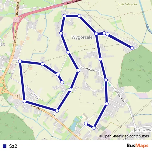 The first stop of the Sz2 bus route is Wygorzele Zimowa and the last stop is Urbanowice Pogodna Szkoła. Sz2 is operational during w dni robocze.