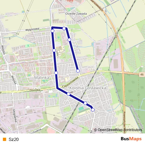 The first stop of the Sz20 bus route is Grudzicka - Szkoła (353) and the last stop is Górna - Częstochowska (111). Sz20 is operational during w dni robocze.