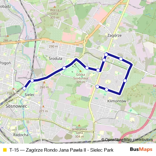 Click here to view the nearest T-15 - Zagórze Rondo Jana Pawła II - Sielec Park bus stop.