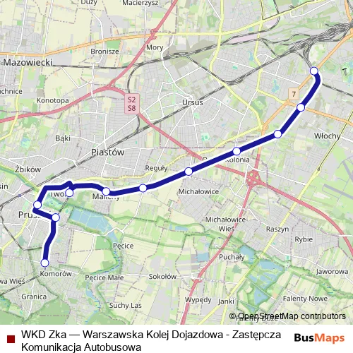 The first stop of the WKD Zka bus route is Komorów and the last stop is Warszawa Aleje Jerozolimskie. WKD Zka (Warszawska Kolej Dojazdowa - Zastępcza Komunikacja Autobusowa) is operational during codziennie.