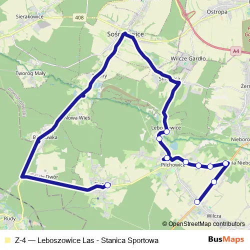 The first stop of the Z-4 bus route is Leboszowice Las and the last stop is Stanica Kościół. Z-4 (Leboszowice Las - Stanica Sportowa) is operational during codziennie.