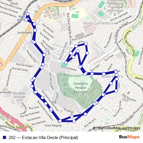 The first stop of the 202 bus route is Rua Maria Jose Assumpcao 170 and the last stop is Rua Maria Jose Assumpcao 170. 202 (Estacao Vila Oeste (Principal)) is operational during todos os dias.