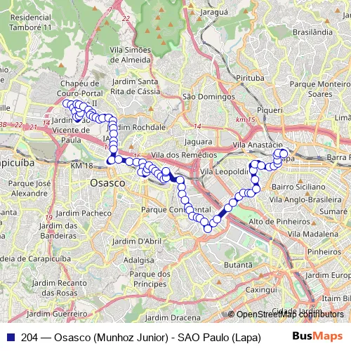 The first stop of the 204 bus route is Terminal Metropolitano Munhoz Junior and the last stop is Rua George Smith 236 - Ponto Final da Linha 113 - Lapa Sao Paulo - SP 05074-010 Brasil. 204 (Osasco (Munhoz Junior) - SAO Paulo (Lapa)) is operational during todos os dias.