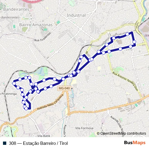 Bus 308 - Estação Barreiro / Tirol in Belo Horizonte: Stops & Timetable