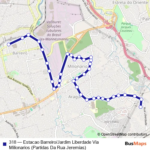 Click here to view the nearest 318 - Estacao Barreiro/Jardim Liberdade Via Milionarios (Partidas Da Rua Jeremias) bus stop.