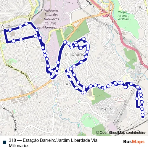 Bus 318 - Estação Barreiro/Jardim Liberdade Via Milionarios in Belo Horizonte: Stops & Timetable