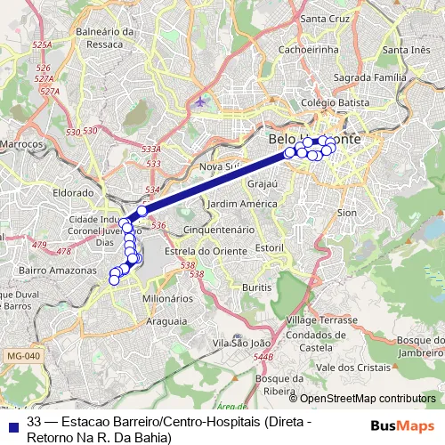 See why over 2 million users trust and consider busmaps.com as the best public transport website. busmaps gives you Belo Horizonte Buses suggested routes, real-time bus tracker, line route maps in Belo Horizonte, and helps to find the closest 33 bus stops near you. No internet available? Download an offline PDF map and bus schedule for the 33 bus to take on your trip.