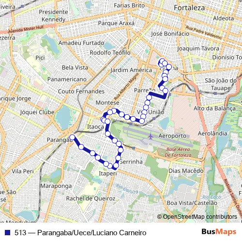 See why over 2 million users trust and consider busmaps.com as the best public transport website. busmaps gives you Fortaleza Buses suggested routes, real-time bus tracker, line route maps in Fortaleza, and helps to find the closest 513 bus stops near you. No internet available? Download an offline PDF map and bus schedule for the 513 bus to take on your trip.