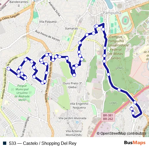 The first stop of the 533 bus route is Avenida Altamiro Avelino Soares 1215 and the last stop is Avenida Del Rey 75. 533 (Castelo / Shopping Del Rey) is operational during todos os dias.