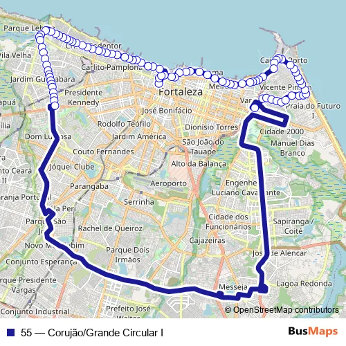 See why over 2 million users trust and consider busmaps.com as the best public transport website. busmaps gives you Fortaleza Buses suggested routes, real-time bus tracker, line route maps in Fortaleza, and helps to find the closest 55 bus stops near you. No internet available? Download an offline PDF map and bus schedule for the 55 bus to take on your trip.