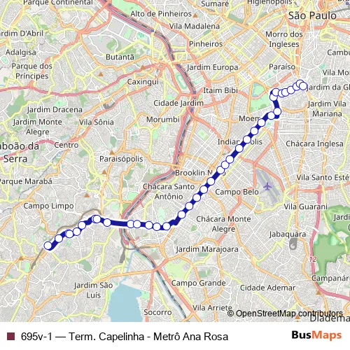 See why over 2 million users trust and consider busmaps.com as the best public transport website. busmaps gives you Sao Paulo Buses suggested routes, real-time bus tracker, line route maps in Sao Paulo, and helps to find the closest 695v-1 bus stops near you. No internet available? Download an offline PDF map and bus schedule for the 695v-1 bus to take on your trip.