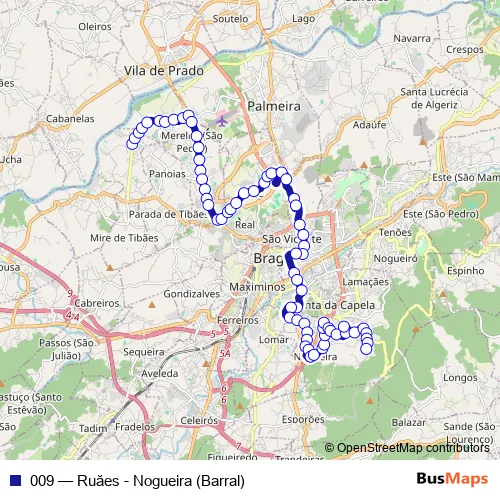 The first stop of the 009 bus route is Ruăes (Mire Tibăes-Verdes) and the last stop is Nogueira (Barral Iv). 009 (Ruăes - Nogueira (Barral)) is operational during todos os dias.
