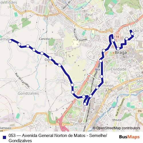 The first stop of the 053 bus route is Norton Matos I and the last stop is Semelhe (Adregăes V-Souto). 053 (Avenida General Norton de Matos - Semelhe/Gondizalves) is operational during todos os dias.