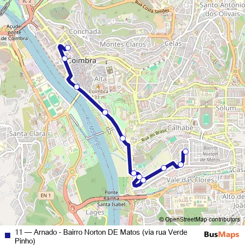 The first stop of the 11 bus route is Bairro Norton de Matos (Centro) and the last stop is Arnado. 11 (Arnado - Bairro Norton DE Matos (via rua Verde Pinho)) is operational during todos os dias.