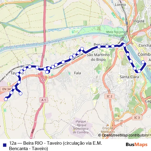 The first stop of the 12a bus route is Portagem (Beira Rio) and the last stop is Taveiro (Zona Comercial). 12a (Beira RIO - Taveiro (circulação via E.M. Bencanta - Taveiro)) is operational during dias úteis.