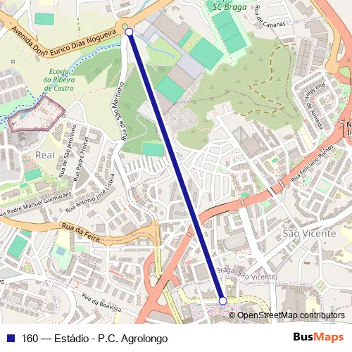 The first stop of the 160 bus route is Conde Agrolongo Iii and the last stop is Rotunda Estádio. 160 (Estádio - P.C. Agrolongo) is operational during todos os dias.