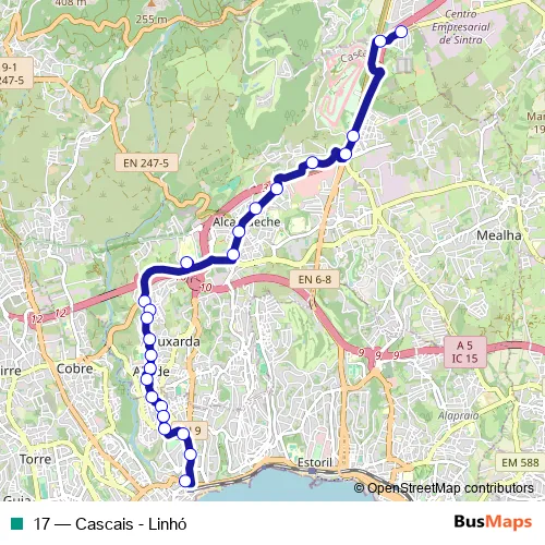 The first stop of the 17 bus route is Prisão do Linhó and the last stop is Cascais - Terminal. 17 (Cascais - Linhó) is operational during todos os dias.