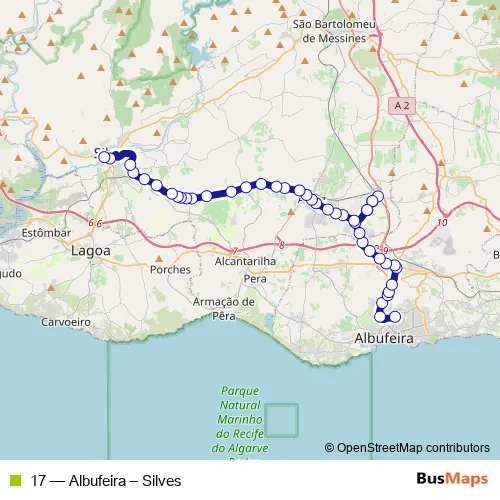 The first stop of the 17 bus route is Albufeira (Terminal Rodoviário) and the last stop is Silves (Bombeiros). 17 (Albufeira – Silves) is operational during todos os dias.