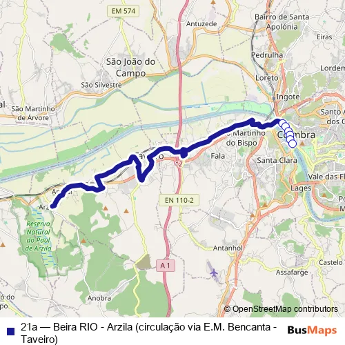 The first stop of the 21a bus route is Rua Padre Estevão Cabral and the last stop is Portagem (Beira Rio). 21a (Beira RIO - Arzila (circulação via E.M. Bencanta - Taveiro)) is operational during todos os dias.