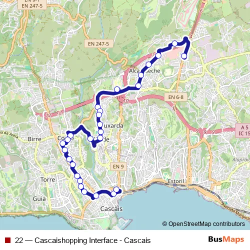 The first stop of the 22 bus route is Cascaishopping - Terminal and the last stop is Cascais - Terminal. 22 (Cascaishopping Interface - Cascais) is operational during todos os dias.