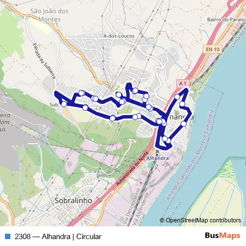 The first stop of the 2308 bus route is Estr Subserra (Alhandra) and the last stop is Estr Subserra (Alhandra). 2308 (Alhandra | Circular) is operational during dias úteis.