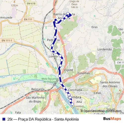 See why over 2 million users trust and consider busmaps.com as the best public transport website. busmaps gives you Coimbra Buses suggested routes, real-time bus tracker, line route maps in Coimbra, and helps to find the closest 25t bus stops near you. No internet available? Download an offline PDF map and bus schedule for the 25t bus to take on your trip.