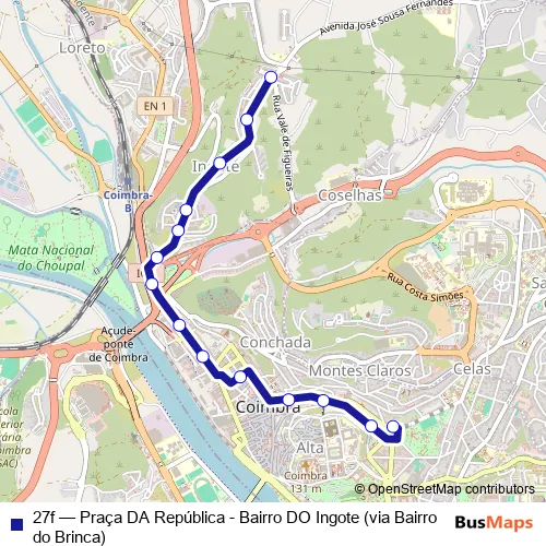 See why over 2 million users trust and consider busmaps.com as the best public transport website. busmaps gives you Coimbra Buses suggested routes, real-time bus tracker, line route maps in Coimbra, and helps to find the closest 27f bus stops near you. No internet available? Download an offline PDF map and bus schedule for the 27f bus to take on your trip.