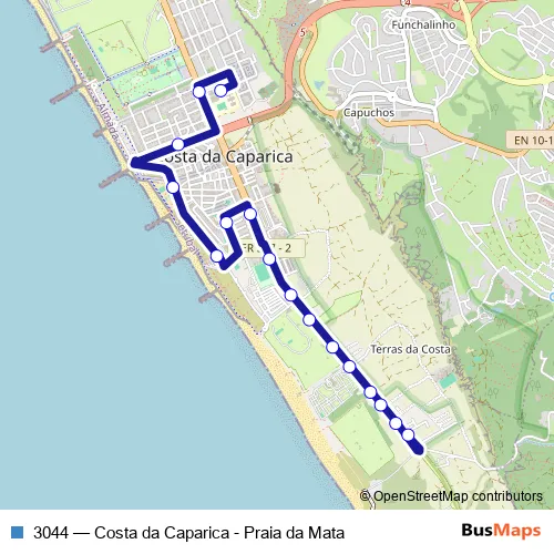 The first stop of the 3044 bus route is Escola Básica da Costa da Caparica and the last stop is Estr Fonte Telha (X) Praia Mata. 3044 (Costa da Caparica - Praia da Mata) is operational during dias úteis.