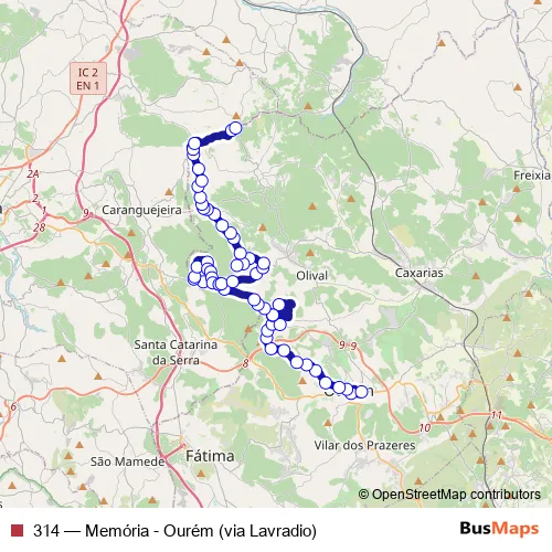 The first stop of the 314 bus route is Ourém (Terminal) and the last stop is Lavradio (R. do Centro). 314 (Memória - Ourém (via Lavradio)) is operational during dias úteis.