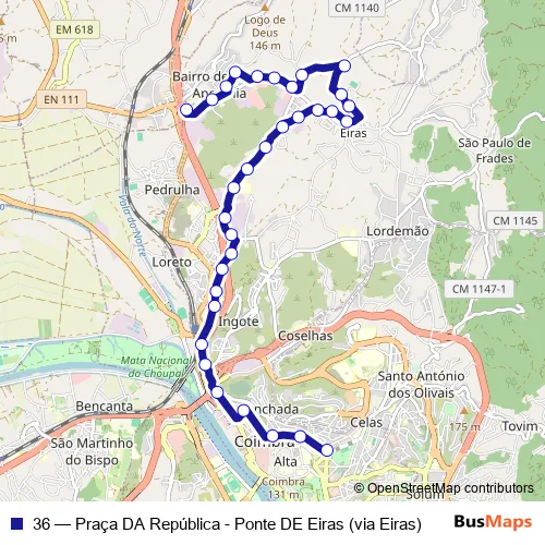 The first stop of the 36 bus route is Praça da República and the last stop is Ponte de Eiras (Interface). 36 (Praça DA República - Ponte DE Eiras (via Eiras)) is operational during todos os dias.