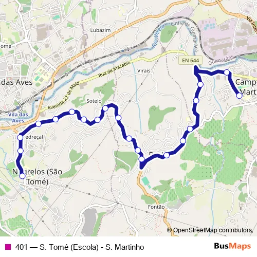 The first stop of the 401 bus route is EB SM Campo and the last stop is E.B. Negrelos. 401 (S. Tomé (Escola) - S. Martinho) is operational during dias úteis.