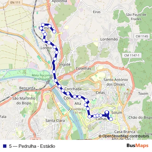 The first stop of the 5 bus route is Pedrulha (Piscinas Municipais) and the last stop is Estádio Cidade de Coimbra (Praça 25 de Abril). 5 (Pedrulha - Estádio) is operational during dias úteis.