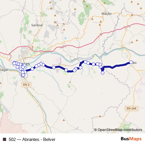 The first stop of the 502 bus route is Central do Pego and the last stop is Abrantes (Terminal). 502 (Abrantes - Belver) is operational during dias úteis.