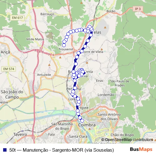 The first stop of the 50t bus route is Largo do Arnado (Av. Fernão de Magalhães) and the last stop is Trouxemil (Senhor dos Aflitos). 50t (Manutenção - Sargento-MOR (via Souselas)) is operational during todos os dias.