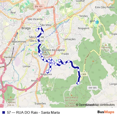 See why over 2 million users trust and consider busmaps.com as the best public transport website. busmaps gives you Braga Buses suggested routes, real-time bus tracker, line route maps in Braga, and helps to find the closest 57 bus stops near you. No internet available? Download an offline PDF map and bus schedule for the 57 bus to take on your trip.
